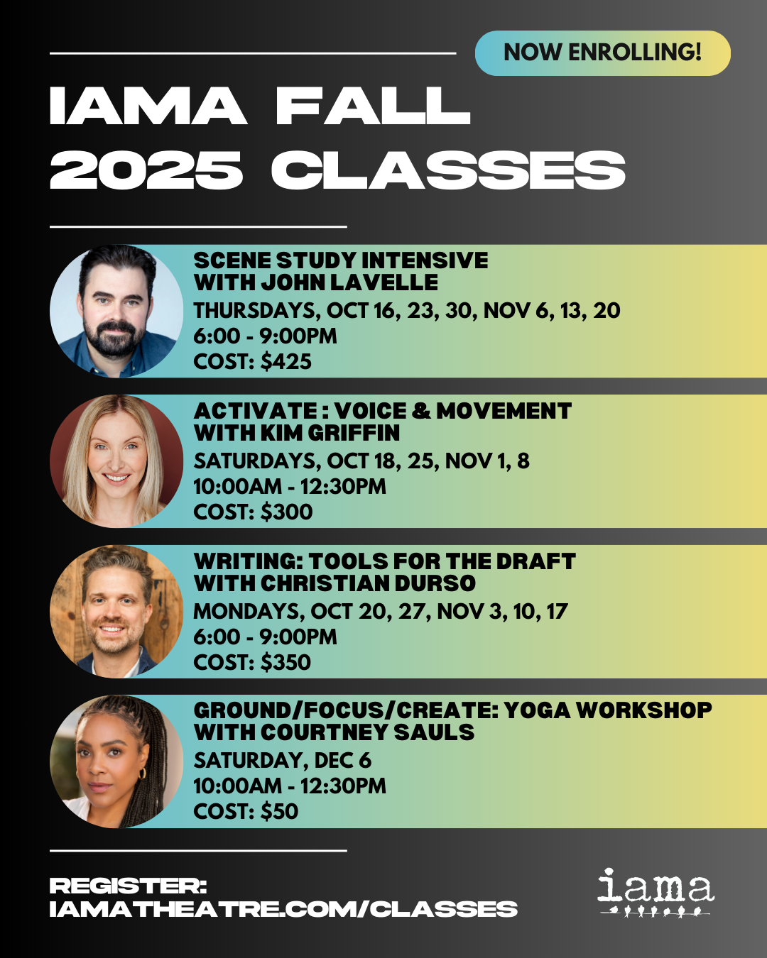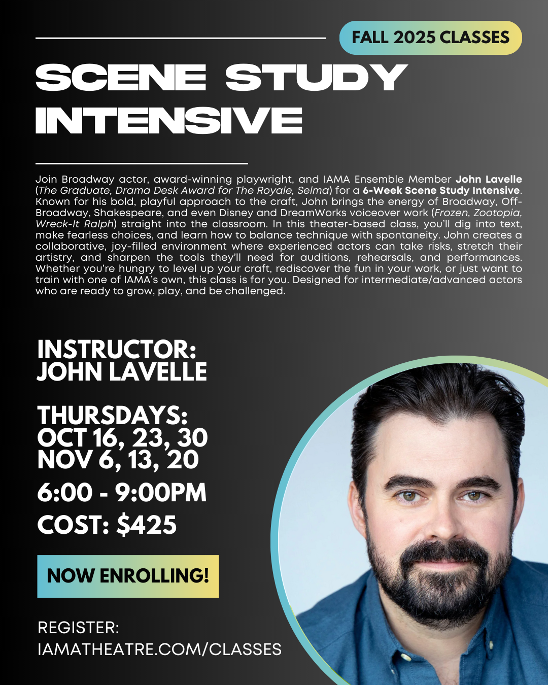 Join Broadway actor, award-winning playwright, and IAMA Ensemble Member John Lavelle (The Graduate, Selma, Drama Desk Award for The Royale) for a 6-Week Scene Study Intensive. Known for his bold, playful approach to the craft, John brings the energy of Broadway, Off-Broadway, Shakespeare, and even Disney and DreamWorks voiceover work (Frozen, Zootopia, Wreck-It Ralph) straight into the classroom. In this theater-based class, you’ll dig into text, make fearless choices, and learn how to balance technique with spontaneity. John creates a collaborative, joy-filled environment where experienced actors can take risks, stretch their artistry, and sharpen the tools they’ll need for auditions, rehearsals, and performances. Whether you’re hungry to level up your craft, rediscover the fun in your work, or just want to train with one of IAMA’s own, this class is for you. Designed for intermediate/advanced actors who are ready to grow, play, and be challenged.