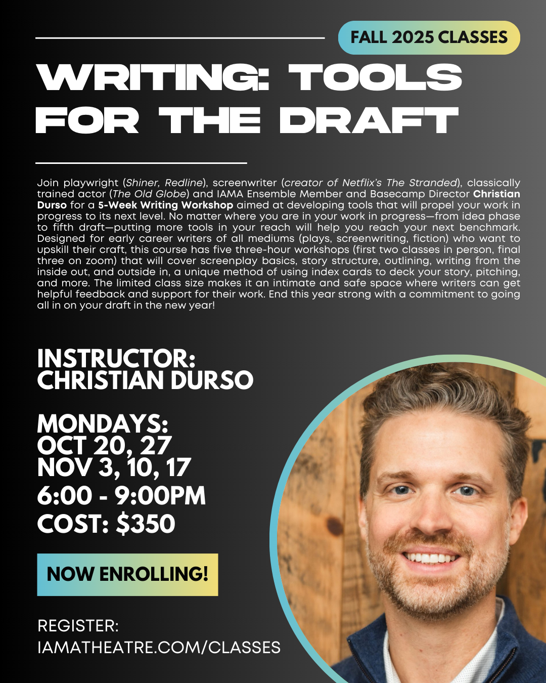 Join playwright (Shiner, Redline), screenwriter (creator of Netflix’s The Stranded), classically trained actor (The Old Globe), and IAMA Ensemble Member and Basecamp Director Christian Durso for a 5-Week Writing Workshop aimed at developing tools that will propel your work in progress to its next level. No matter where you are in your work in progress—from idea phase to fifth draft—putting more tools in your reach will help you reach your next benchmark. Designed for early career writers of all mediums (plays, screenwriting, fiction) who want to upskill their craft, this course has five three-hour workshops (first two classes in person, final three on zoom) that will cover screenplay basics, story structure, outlining, writing from the inside out, and outside in, a unique method of using index cards to deck your story, pitching, and more. The limited class size makes it an intimate and safe space where writers can get helpful feedback and support for their work. End this year strong with a commitment to going all in on your draft in the new year!
