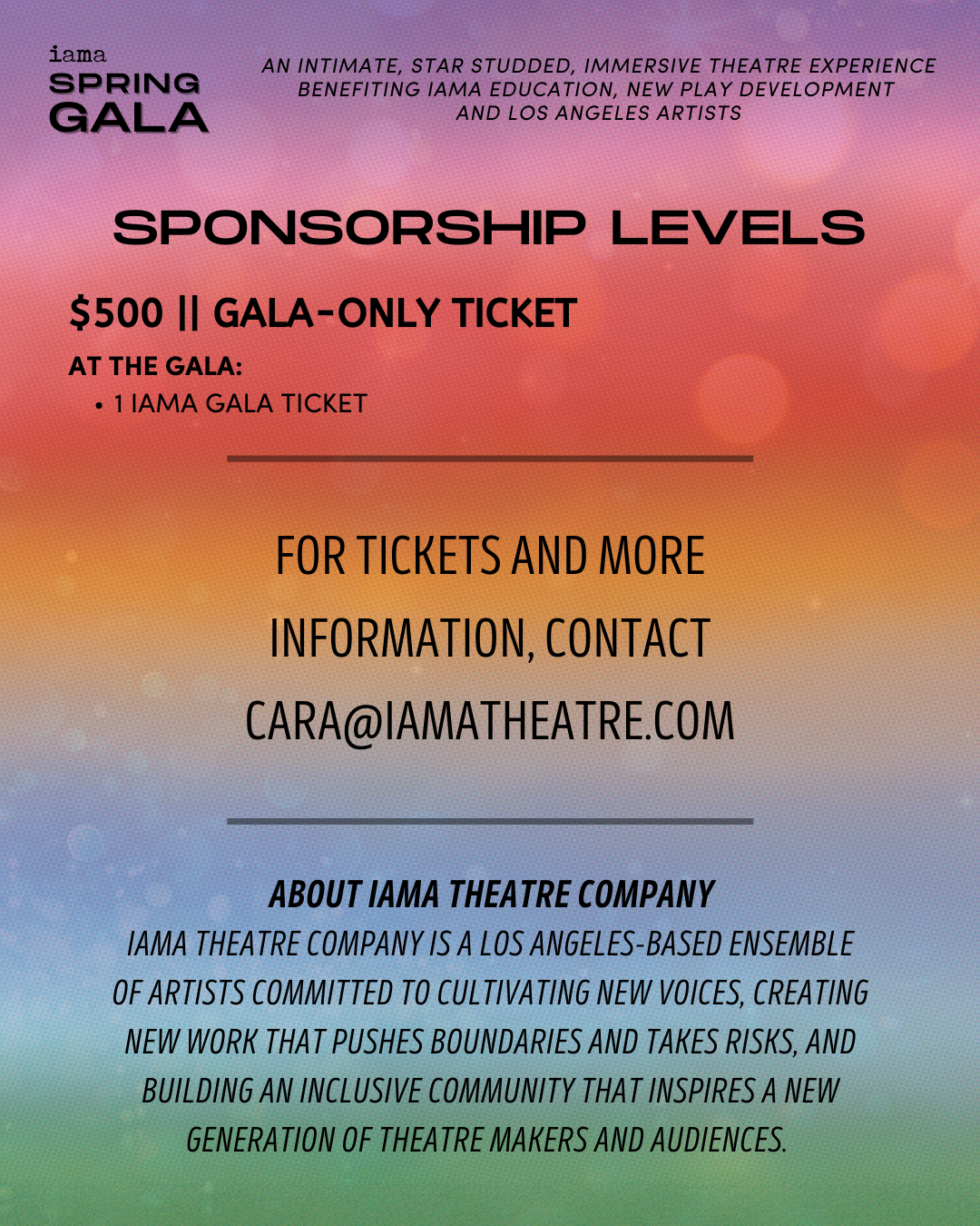 IAMA Theatre Company is a registered 501(c)(3) nonprofit organization. We rely on the generous contributions of our supporters to supplement income from ticket sales. All donations to IAMA are tax-deductible to the full extent allowed by the law. Tax I.D. number: 47-3447666.